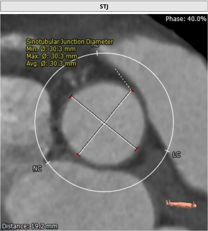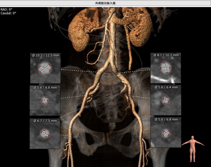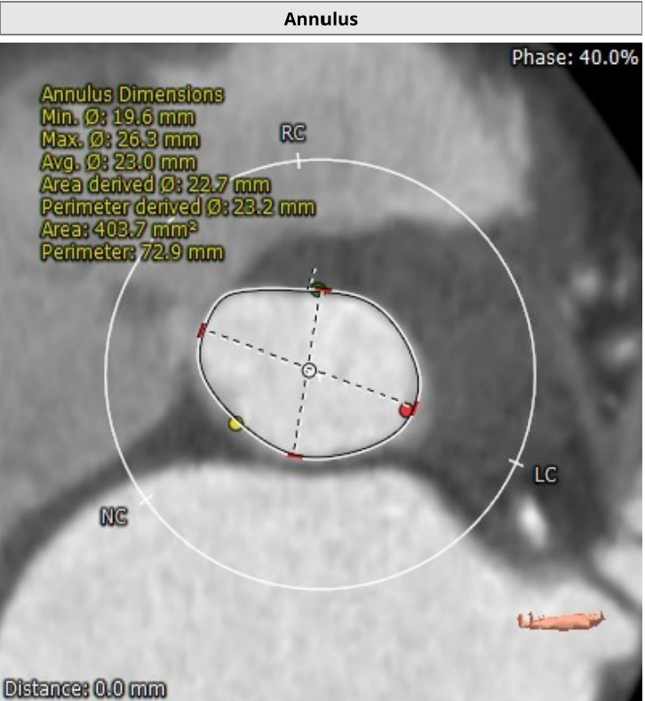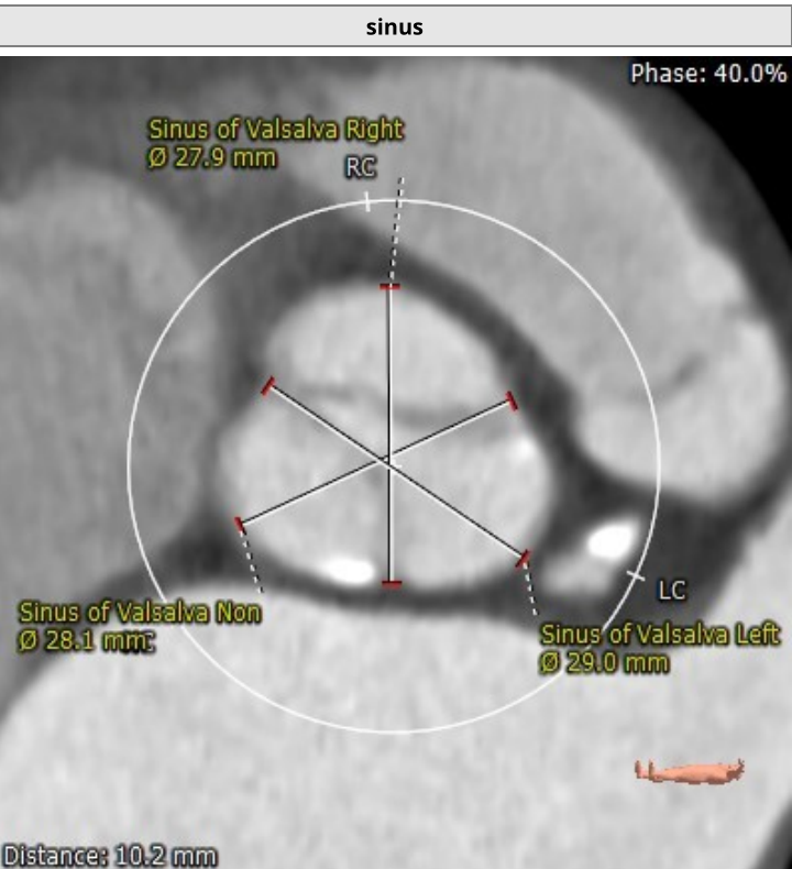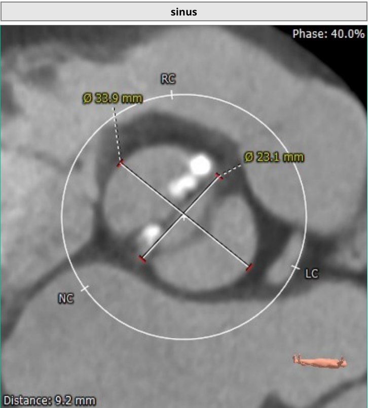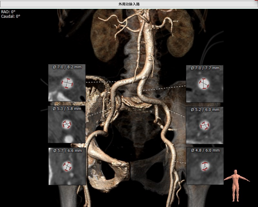 该名患者为三叶瓣,右冠窦轻度钙化。瓣环直径为23.2mm,周长为72.9mm。左冠窦中重度钙化。升主动脉稍增宽,平均直径34.0mm。左冠开口高度13.3mm,右冠开口高度15.1mm,冠脉风险低。外周血管钙化轻,入路情况较佳。