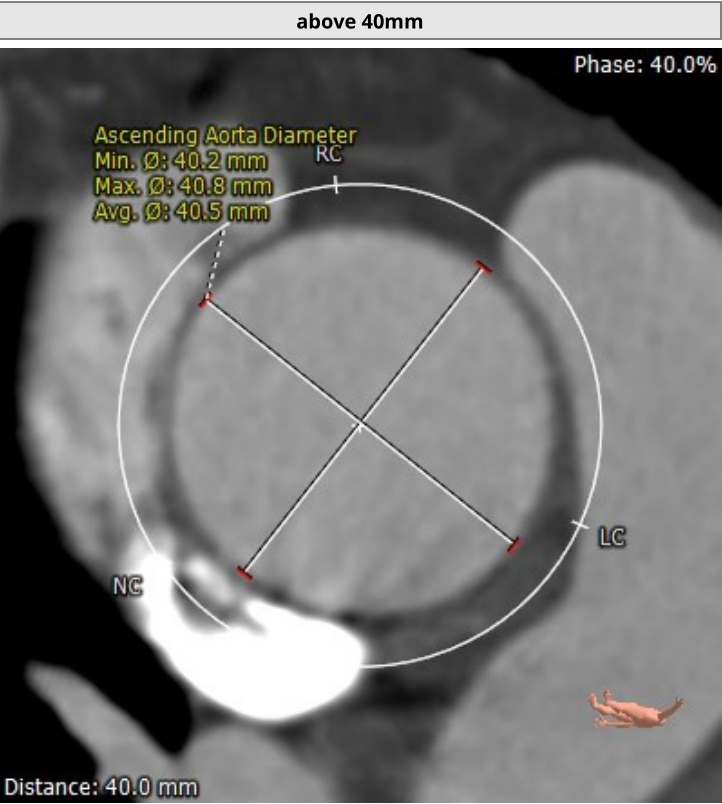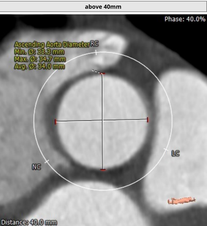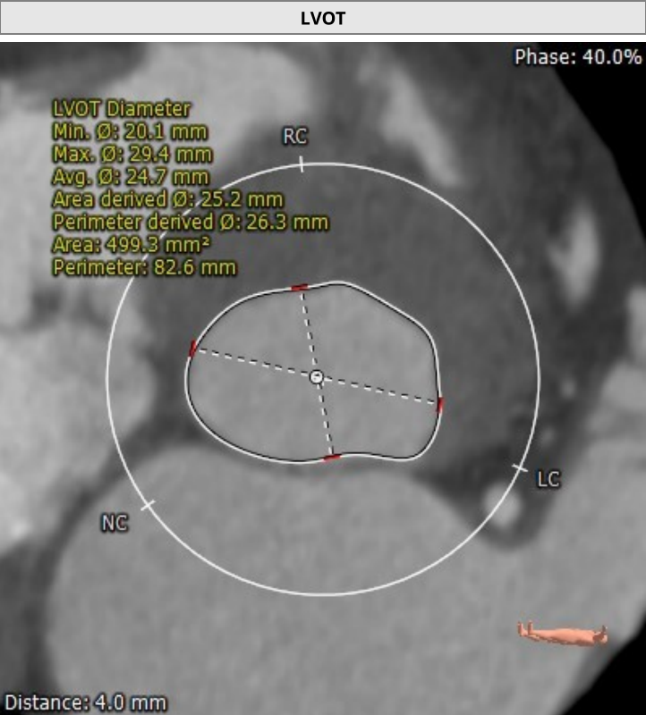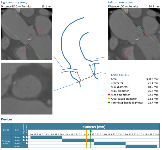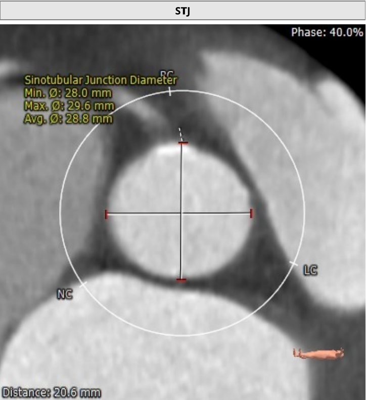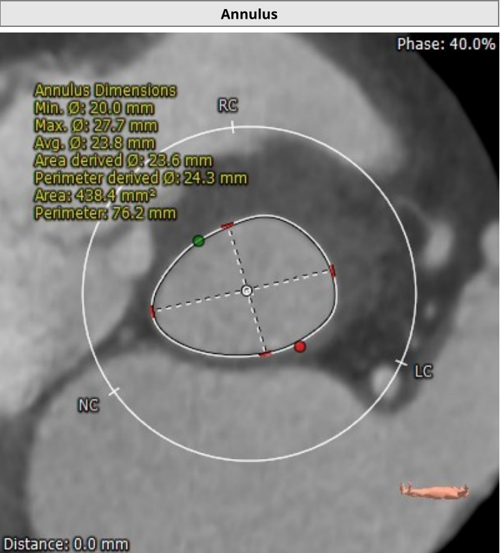 该名患者为三叶瓣,右冠窦轻度钙化。瓣环直径为23.2mm,周长为72.9mm。左冠窦中重度钙化。升主动脉稍增宽,平均直径34.0mm。左冠开口高度13.3mm,右冠开口高度15.1mm,冠脉风险低。外周血管钙化轻,入路情况较佳。