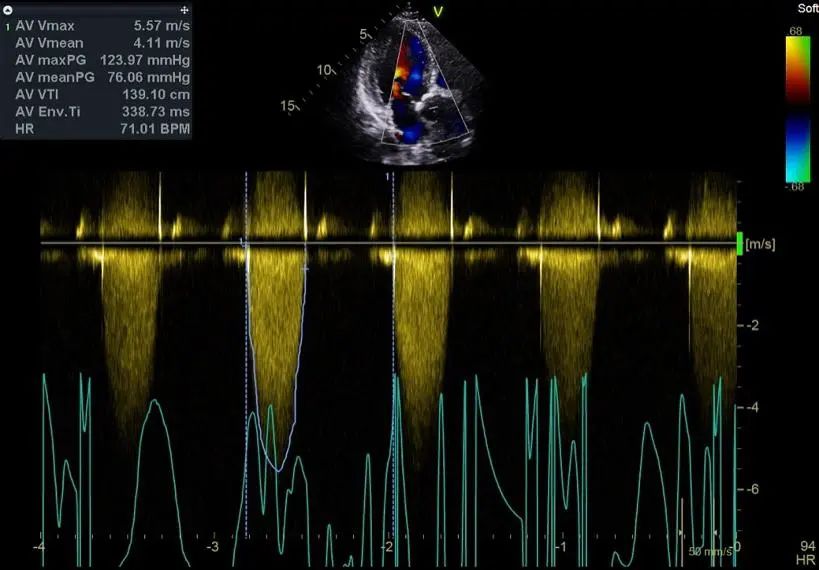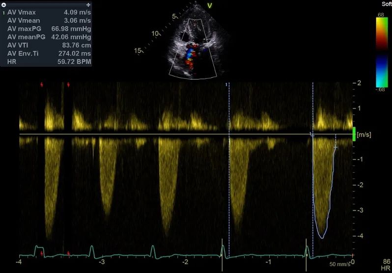 动态心电图示频发房性早搏伴短阵房速。肺功能检查提示轻度阻塞性通气功能障碍。头颅MRI未见明显脑梗征象。入院后食道超声提示该患者为主动脉瓣二瓣化畸形、重度狭窄伴轻度关闭不全。峰值流速5.57m/s,最大跨瓣压差124mmHg,平均跨瓣压差76mmHg,瓣口面积为0.41cm2。