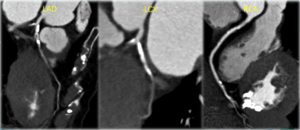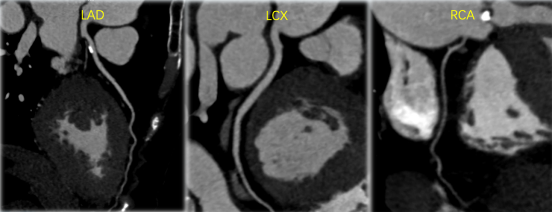 CT冠脉评估患者三支主干未见严重狭窄。前降支近段存在一30%狭窄的钙化斑块,右冠细小,为左优势型冠脉。