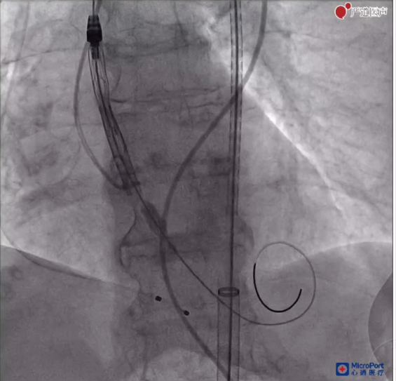 由于该患者轻度横位心,且为前后位二叶瓣,输送系统跨瓣存在一定困难,与会专家和术者一致考虑使用Snare技术。在右冠窦猪尾的指示和圈套器的辅助下,瓣膜输送系统输送至窦底,开始释放。在确认位置后,术者保持当前张力,快速一次性释放。