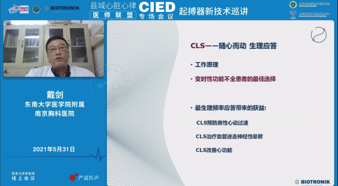 会议开场后,首先由东南大学医学院附属南京胸科医院戴剑教授为大家详细解析CLS的临床应用。戴剑教授首先为大家讲解了CLS的基本原理,并且通过比较不同的频率应答感受器的优势和缺点可以看出,CLS是目前为止最为生理的频率应答感受器,是变时性功能不全的患者的最佳选择。同时通过相关大量的研究证据,可以证实CLS不仅能够减少房颤负荷,还可以在患者晕厥之前预判晕厥的发生从而进行干预,有效地治疗血管迷走性晕厥。