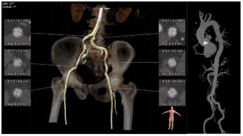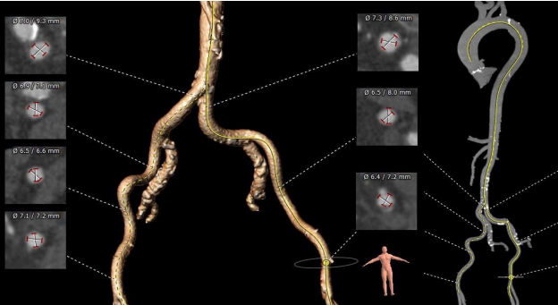 主动脉弓部夹角略锐,角度84度,最短距离70.3mm,必要时可采取Snare辅助过弓;外周入路血管条件良好,无钙化,未发现其他血管病变,双侧入路血管管径可。