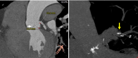 杨毅宁教授团队术前讨论,考虑患者三叶式主动脉瓣,中度钙化,且钙化分布不均匀主要分布于无冠窦,瓣膜植入过程中对假造成体挤压形变,需关注瓣周漏风险。患者左冠高都略低,测量发现瓣叶长度接近-超过左冠开口,可能形成冠脉阻挡风险。