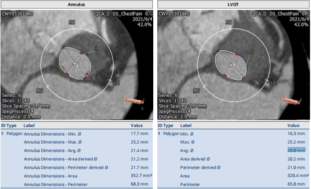 此次手术对象为一名老年女性患者,身高155cm,体重51kg。因“胸闷憋气,咳嗽半年”入院,心超诊断主动脉瓣重度狭窄伴轻度关闭不全,二尖瓣轻度反流,三尖瓣轻-中度反流,肺动脉瓣轻度反流,室间隔心肌肥厚、升主动脉扩张,左室舒张功能降低。既往冠心病20年,平素间断服用“阿司匹林”等药物。术前CT显示患者主动脉瓣口面积352.7 mm²,瓣环平均直径21.4mm,瓣周长68.3 mm;LVOT面积320.4 mm²,平均直径20.8 mm。江磊教授于术后采访中点明了本例TAVR手术操作棘手之处。江教授指出,从术前影像学来看,病人为三叶瓣,这是其一;此次手术最主要的难点则在于病人的左冠较低,而TAVR手术中对于冠脉的最低要求应在瓣环上1公分左右,此例手术患者又恰好处于友好临界值上0.9cm。因此,为规避冠脉阻塞风险,江磊教授团队决定采用SAPIEN 3球扩式瓣膜。“如果使用自膨式瓣膜,冠脉阻塞风险相对来说高一些,而SAPIEN 3是一款球扩式瓣膜,可以最大程度的避免左冠闭塞的风险,同时考虑到患者家庭诉求,我们在综合考量下选择SAPIEN 3瓣膜,事实也证明它的确能发挥这样的效用。”