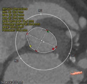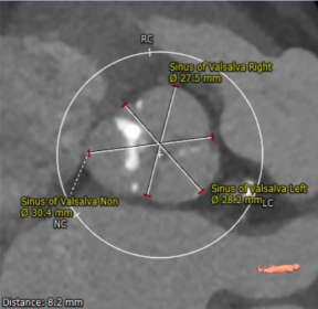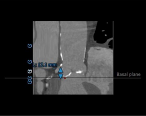 CT数据显示该患者为三叶式主动脉瓣,中度钙化,钙化分布不均,主要位于瓣叶边缘及血管壁附着;瓣叶未见明显增生肥厚。