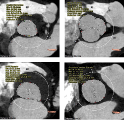 CT结果显示,患者为三叶式主动脉瓣,轻度钙化,瓣叶明显增生肥厚但未见明显融合,结合瓣上结构和左室流出道结构特点,较大可能影响瓣膜植入后的形态及贴壁性,存在瓣膜向下位移的风险,且大概率需要使用瓣中瓣策略完成手术。在瓣膜尺寸的选择上要更为精准,在瓣膜释放时,释放位置更要把握好。该患者还存在弓部夹角锐利,弓部宽度较短,且降主动脉扭曲,极大地考验了器械输送系统的过弓性能。