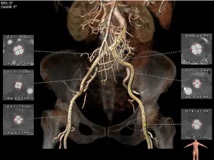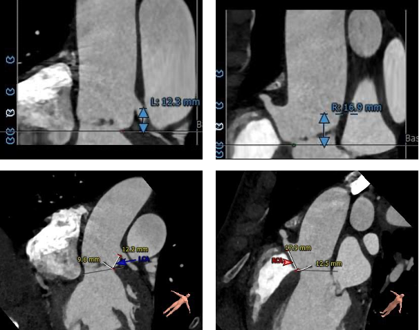 双侧股动脉管径尚可,主动脉弓部夹角锐利(54°)、弓部宽度较短(最短处仅58.8mm),降主动脉轻度扭曲,输送器过弓、跨瓣难度较高。