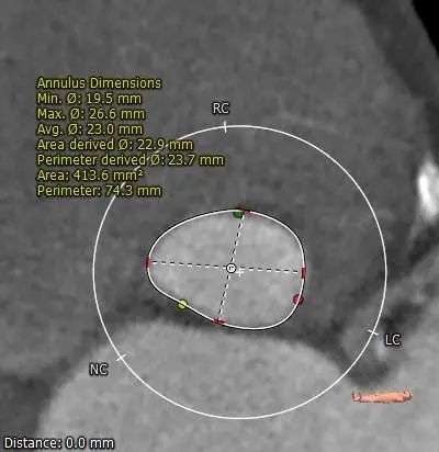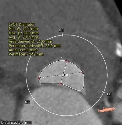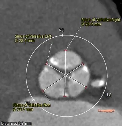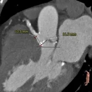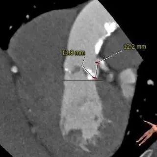 左右冠高度合适,冠脉可见局部钙化,左冠瓣长度>冠脉开口与瓣叶附着缘距离。