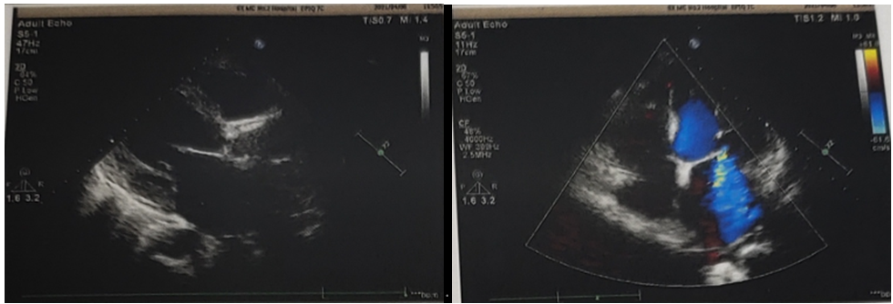 主动脉瓣评估:左房、左室增大,主动脉瓣增厚,回声增强,可见钙化,右冠瓣活动僵,瓣口收缩期血流流速增快,瓣口舒张期可见反流。