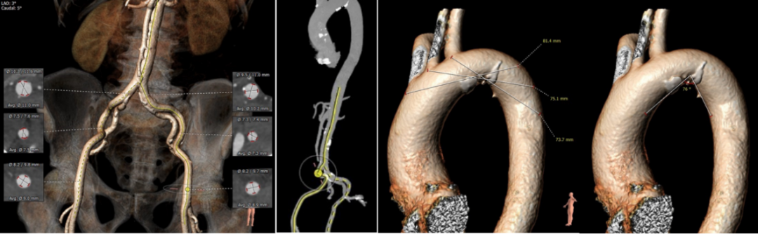 ▪ 主动脉瓣环与水平面夹角较大61°,横位心,主动脉弓角度较锐利76°,弓距良好。