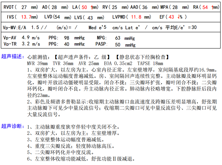 术前心脏超声结果显示,患者主动脉瓣重度钙化,开放受限,关闭不拢。主动脉瓣瓣口流速4.9m/s,峰值跨瓣压差98mmHg,平均压差63mmHg。LVEF 43%。