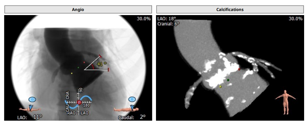 术前CT结果显示,主动脉瓣极重度钙化;主动脉瓣口面积562.8mm²,瓣环平均直径27.4mm,瓣环周长85.6mm;LVOT面积626.9mm²,LVOT平均直径28.4 mm。CT同时显示外周入路血管重度扭曲合并右侧腹主动脉瘤样病变。