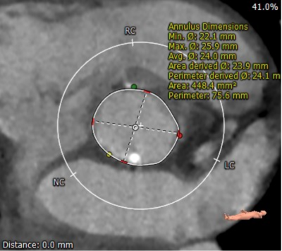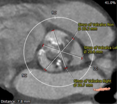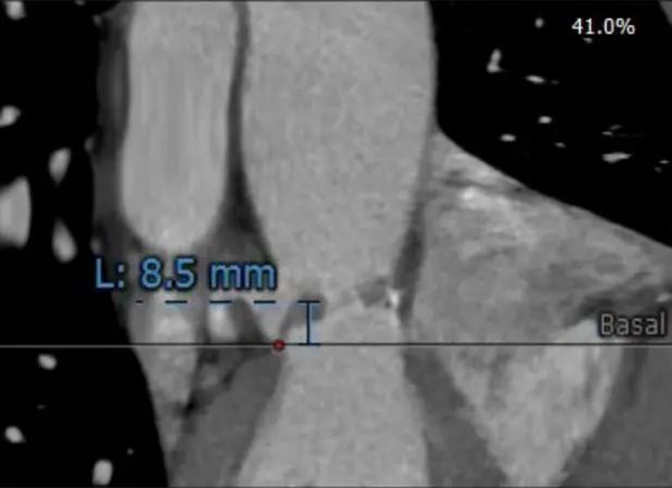 患者男性,70岁,重度钙化型主动脉瓣狭窄,STS评分8.6%,常规外科手术高风险。术前心脏超声提示主动脉瓣严重增厚钙化,峰值流速5.4m/s,平均跨瓣压差82mmHg。CT评估结果显示主动脉瓣重度钙化,瓣环平均直径23.9mm,瓣环面积448.4mm²。左冠脉开口高度8.5mm,右冠脉开口高度12.2mm。该患者左、右冠状动脉开口高度低,左冠瓣叶较长伴钙化,且瓦氏窦较小,窦管交界处高度低,冠状动脉阻塞风险高,手术操作复杂。
