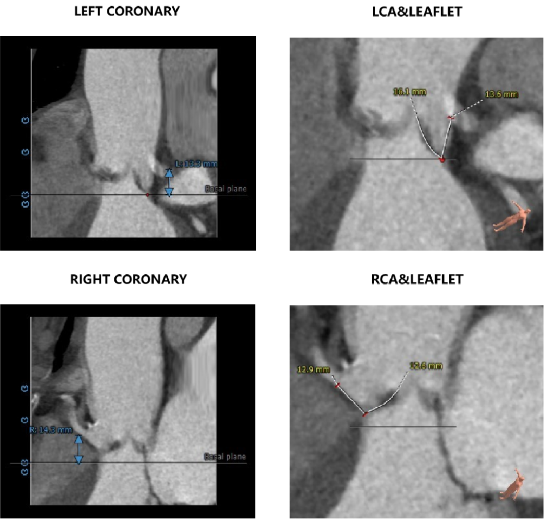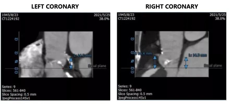 2. 左冠开口高度14.3mm,右冠开口高度16.4mm,高度可,根据瓦氏窦内径和瓣叶长度综合判断,冠脉堵塞风险小,双侧冠脉钙化严重。