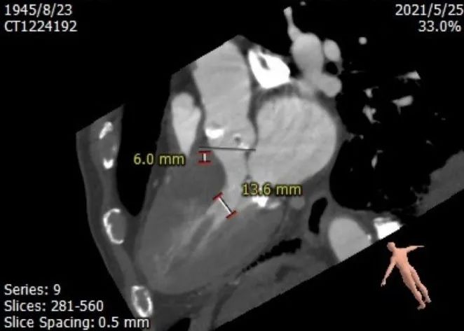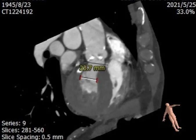 患者为75岁老年男性,主诉“间断性胸闷2个月”入院,临床主要诊断为“主动脉狭窄(重度)合并右冠狭窄、小左室”。既往患高血压40年,“冠心病”病史30余年,患有糖尿病20年,脑梗死后遗症20年,慢性阻塞性肺疾病8年,左侧肢体活动欠灵活。入院超声提示重度主动脉瓣狭窄,主动脉根部直径21mm,窦部直径27mm,左室射血峰值流速5.05m/s,主动脉平均跨瓣压差49mmHg。CT报告示主动脉瓣钙化明显,左右冠存在明显钙化斑块,左室前后径28.7mm。