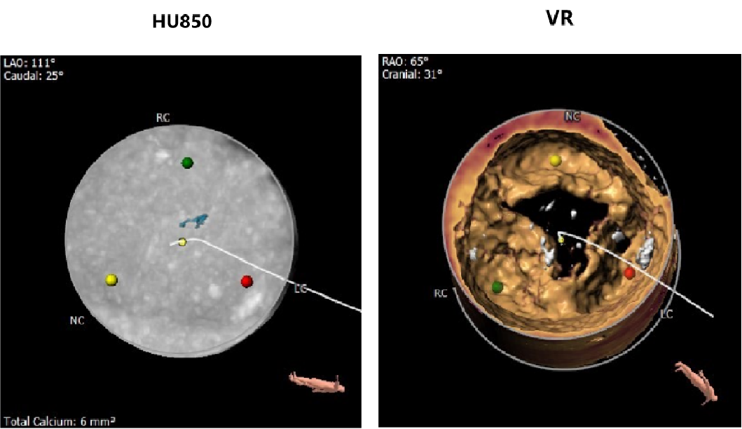 这是一例单纯AR合并多种基础疾病的病例。患者主动脉根部未见明显钙化,径向锚定力来源较单一,术前评估考虑存在较大瓣膜移位风险。同时患者双侧冠状动脉可见钙化亮影,术中及瓣膜植入后,须避免冠脉封堵或灌注不良的发生。