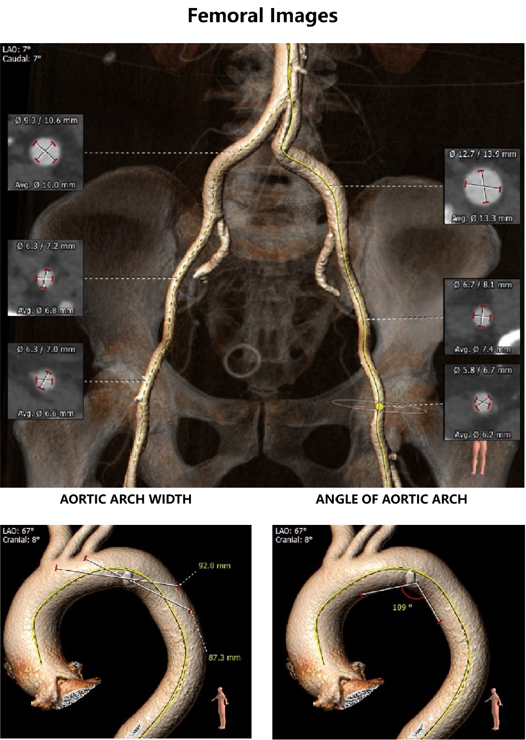 患者主动脉弓角度、弓距可。双侧入路血管内径可,CT见明显钙化,股动脉分叉位置可,右侧股动脉存在钙化斑块,存在血管损伤风险。