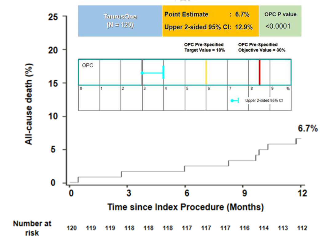 TaurusOne临床试验由中国医学科学院阜外医院高润霖院士牵头,中国医学科学院阜外医院吴永健教授、杨跃进教授、徐波教授、宋光远教授、王墨扬教授,四川大学华西医院陈茂教授、冯沅教授,浙江大学附属第二医院王建安教授、刘先宝教授,中南大学湘雅二医院周胜华教授、方臻飞教授,北部战区总医院韩雅玲院士、徐凯教授,哈尔滨医科大学附属第二医院于波教授共同参与研究,国家心血管病中心医学统计部李卫教授担任统计专家。TaurusOne这一具有中国自主知识产权, 完全由中国研发设计的器械的临床试验初步结果于2020年5月EuroPCR late breaking trials由阜外医院吴永健主任首次展示在国际专家面前,引发关注。一年后,国内六大临床中心的研究者们与加拿大麦吉尔大学医学中心Nicolo Piazza教授在EuroIntervention发表文章,一同介绍TaurusOne这一中国创新器械的设计特点和临床试验结果。值得关注的是,在科学严谨甚至严苛的入组标准下,TaurusOne入组患者STS评分是国产经导管主动脉瓣系统上市前临床试验中最高的,STS评达到9.95 ± 3.09。纽约心功能分级 III-IV占比高达89.1%,二叶瓣比例为35%。患者术后12个月全因死亡率6.67%,冠脉阻挡发生率0。术后12个月随访结果显示仅1例发生中度瓣周漏,无重度瓣周漏;有效瓣口面积和跨瓣压差在12个月随访中明显改善;受试者术后心功能持续改善,12个月后NYHA Ⅳ级占比为0%。TaurusOne临床试验结果令人满意,多项关键临床终点好于同代同类国际品牌的器械上市前临床数据。