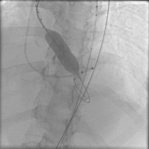主动脉根部造影,主动脉狭窄伴有明显反流,采用18mm球囊预扩,轻微腰征,造影无漏。