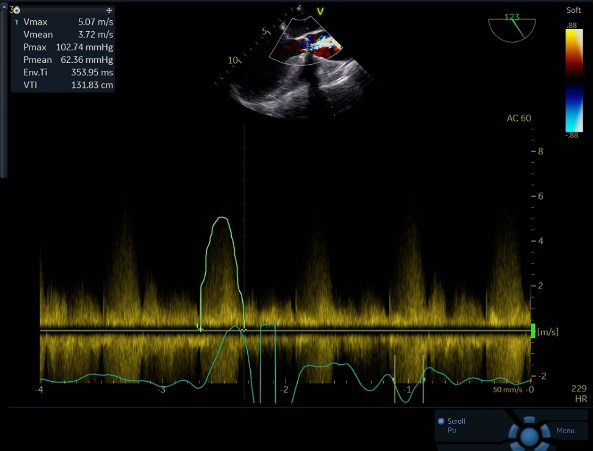 患者71岁女性,入院超声检查显示主动脉瓣重度狭窄并轻度关闭不全、瓣叶增厚、回声增强,活动受限峰值流速473cm/s,平均压差60mmHg,最大压差90mmHg,瓣口面积约0.27cm2。左心增大,LVEF 37%,升主动脉增大。