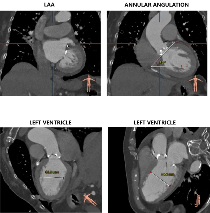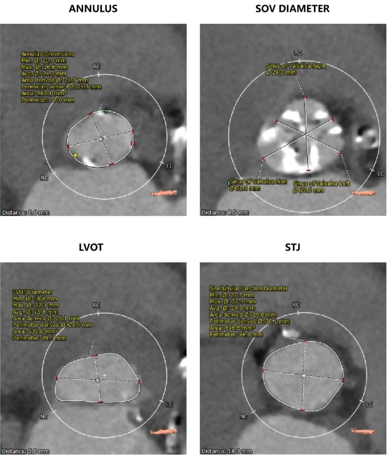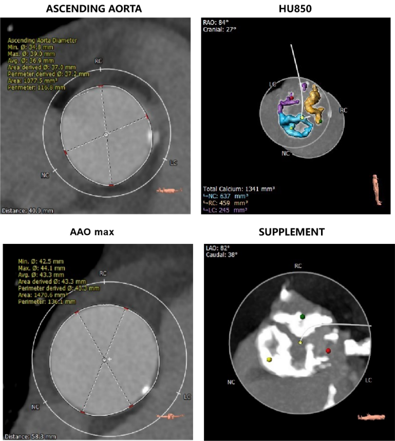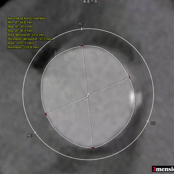 主动脉瓣瓣环周长77.0mm,平均周长径 24.5mm;LVOT周长89.1mm,平均周长径28.4mm;SOV:28.5mm*29.3mm*32.0mm;STJ平面周长94.6mm;瓣叶增厚,瓣上钙化明显,HU850积分1341mm³, HU560积分2499mm³,升主动脉最大直径44.1mm。