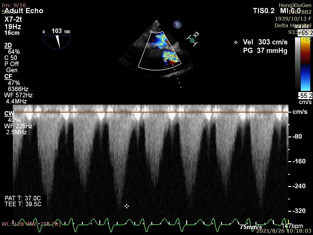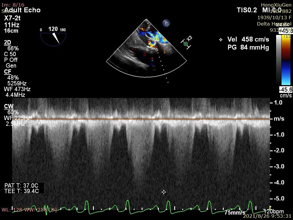 入院行相关辅助检查后,心电图示“窦性心动过速;S-T段变化;左心室高电压”;心脏彩超示“主动脉瓣狭窄(重度)伴关闭不全(轻度)、峰值流速450cm/s、平均压差46mmHg、估测主动脉瓣开放面积0.7cm²;二尖瓣关闭不全(轻中度),三尖瓣少量反流,左室收缩功能减低;LVEF:36%”。
