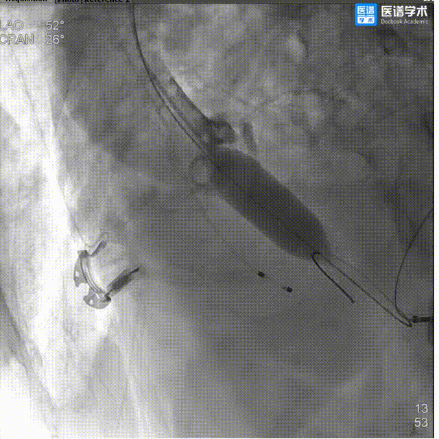 5、180次/分快速起搏下以22mm 球囊进行第二次预扩张,扩张同时造影示明显腰征,球囊受挤压下滑,右冠显影不明显,考虑灌注不良,超声示两次球扩未造成患者主动脉根部明显损伤变形;