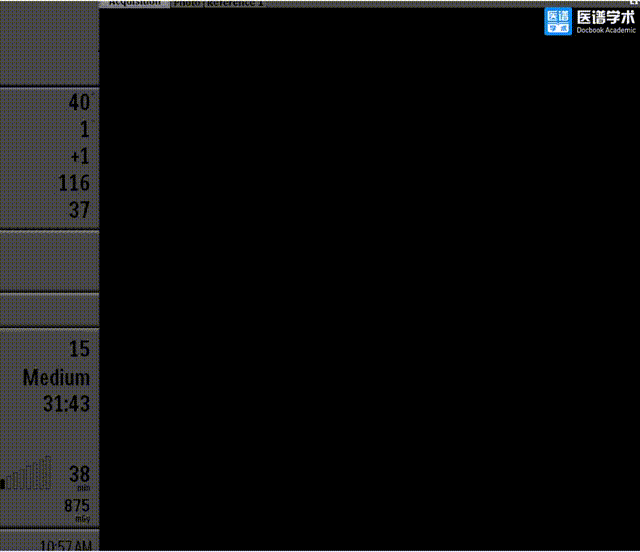 4、180次/分快速起搏下以22mm 球囊进行第一次预扩张,扩张同时造影示明显腰征,球囊受挤压上跳。扩张后超声示跨瓣压差37mmHg,峰值流速303cm/s,主动脉狭窄情况得到改善,主动脉瓣叶活动性增强;