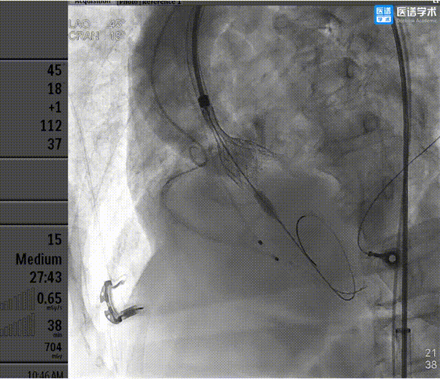 10、猪尾导管测压显示,平均跨瓣压差约2mmHg,造影示瓣膜定位良好、开放良好,极少量瓣周漏,患者血流动力学指标稳定,血压约101/55mmHg,人工瓣膜开口面积2.06cm2,标志手术成功。