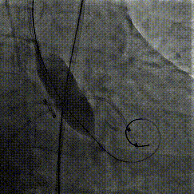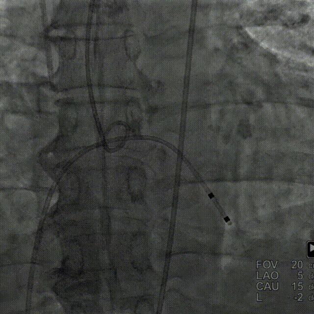 • 右侧股动脉为主入路,左侧辅助入路,左股静脉植入临时起搏器电极,选择20F血管鞘;