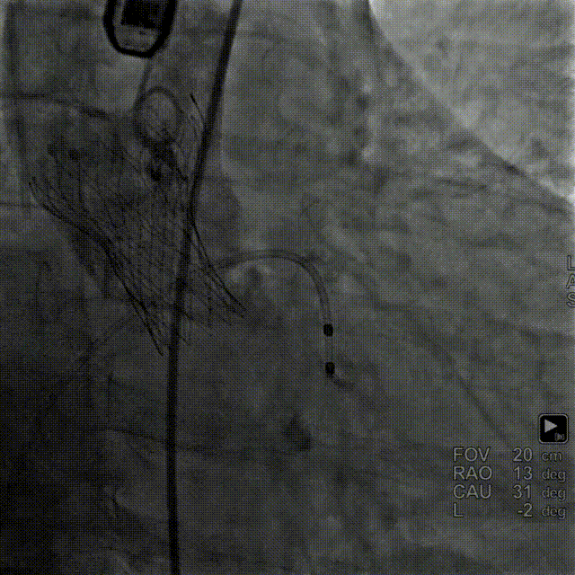 • 预装AV26瓣膜,释放角度推荐RAO 22° CAU 38°(左右重合)左右,释放较高位(瓣环下2mm左右)。释放后调整至左前斜头位进一步确定人工瓣膜形态。手术结束后造影评估入路血管情况,避免遗漏血管并发症情况。