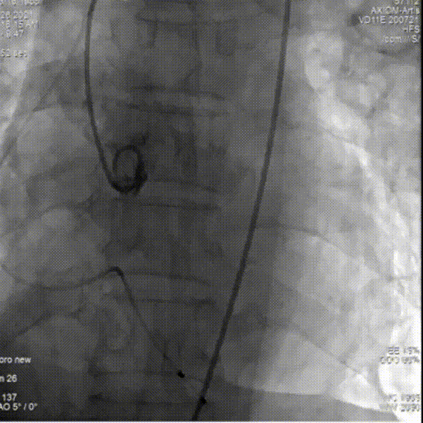 3.患者双侧入路血管条件合格,常规选择右侧股动脉为主入路,左侧为辅入路。外周入路整体条件良好,管径偏细,使用内联鞘代替大鞘建立人工瓣膜通路。