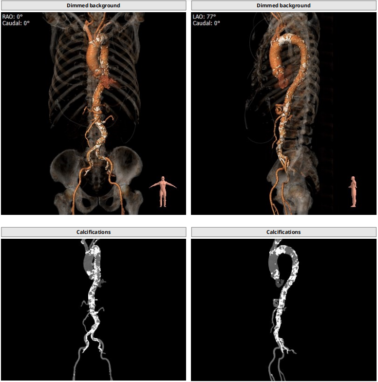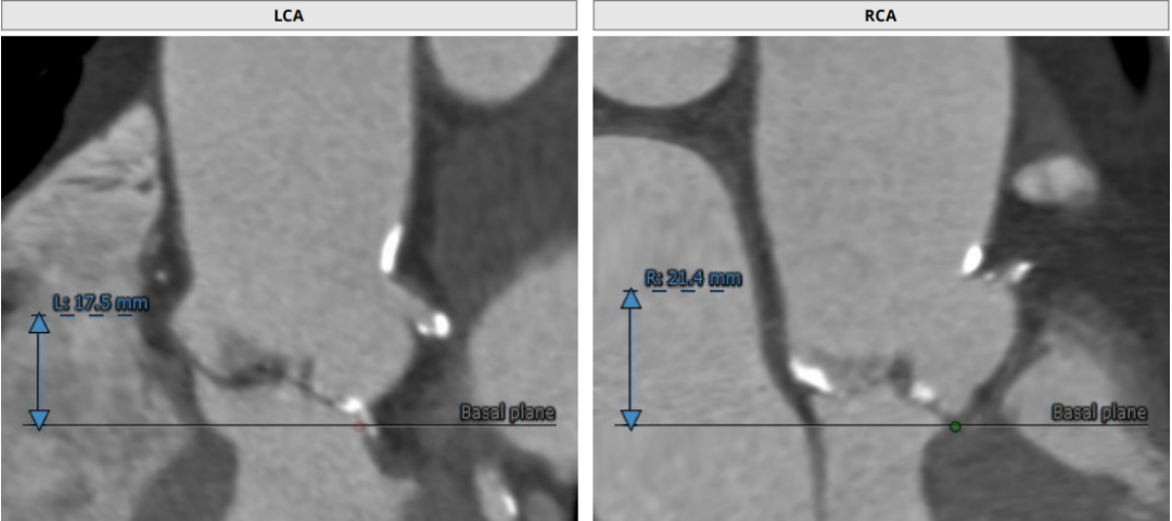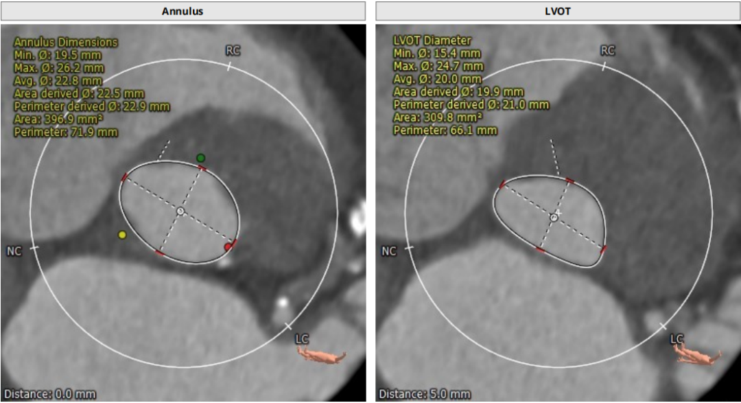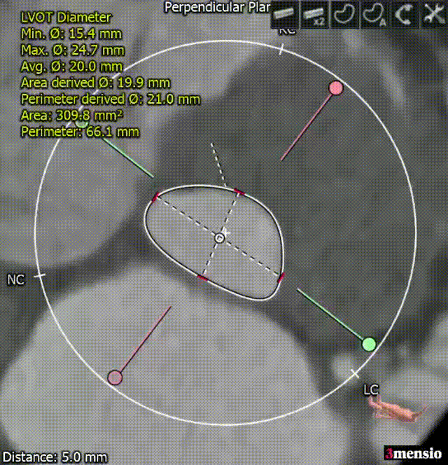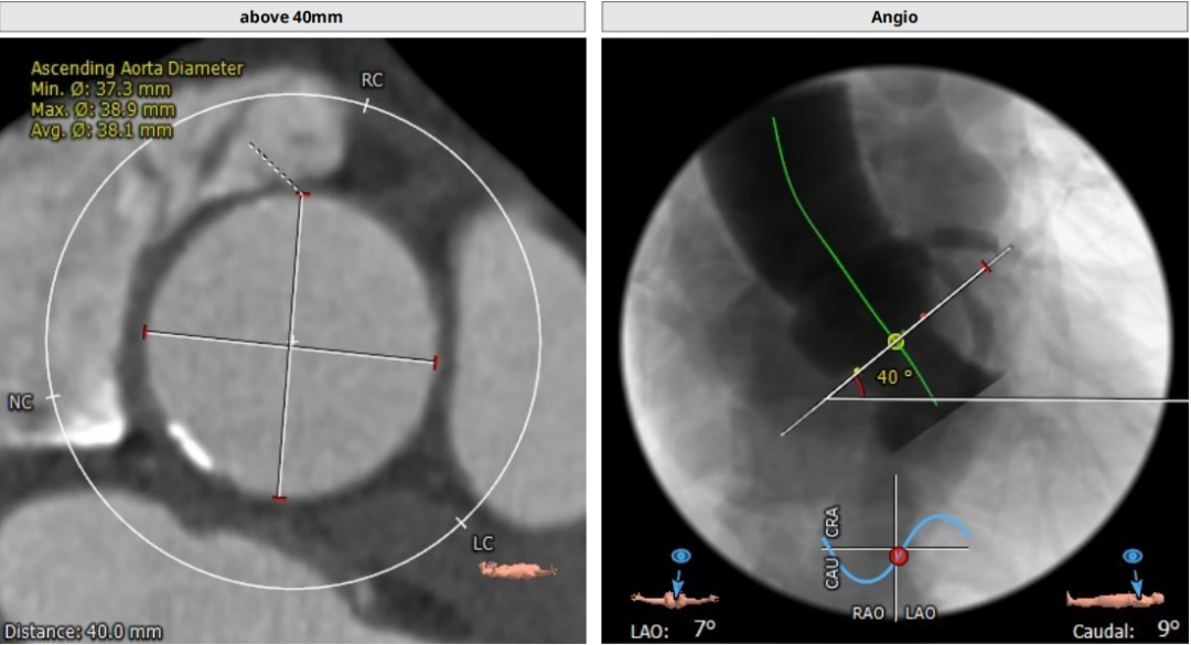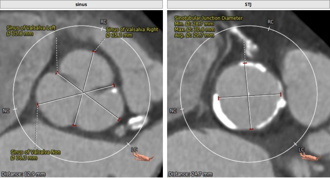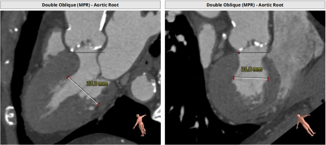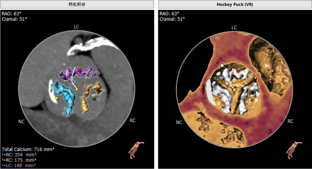 三叶瓣,重度钙化,钙化主要分布在瓣叶游离缘,法式窦结构较大,双冠高度较高,升主动脉未见明显扩张,心脏角度40°,左室大小可,心肌肥厚,主动脉弓部走行较平缓,主动脉弓部可见钙化,过弓轻柔谨慎,以右侧股动脉为主入路。