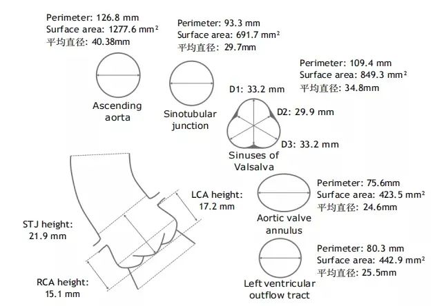 主动脉瓣环:平均直径24.6 mm、周长75.6 mm