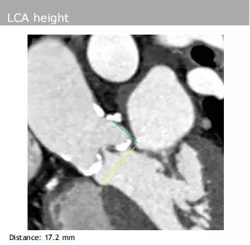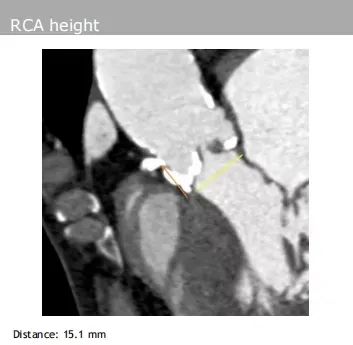 左、右冠脉高度:分别为17.2 mm、15.1 mm,且双侧冠脉开口均有钙化