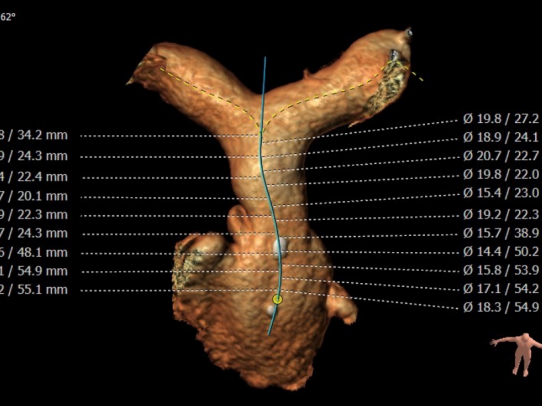 患者男性,19岁,法洛氏四联症根治术后12年。超声提示肺动脉瓣重度反流、三尖瓣中度反流。术前行详细影像学重建与评估,主肺动脉腰部截面为不规则形,径宽22-30mm,形态测算植入介入瓣后直径26mm。术中肺动脉造影测量与术前评估一致。手术经胸入路,在TEE引导下,经右室流出道穿刺植入26号Salus介入肺动脉瓣,术后TEE提示肺动脉介入瓣植入位置理想、固定良好,无瓣周漏及中央反流。