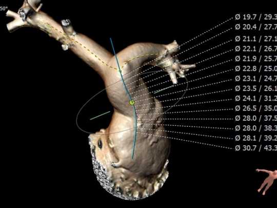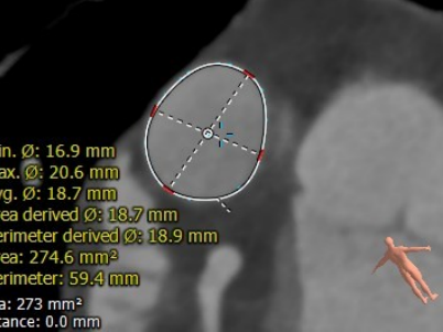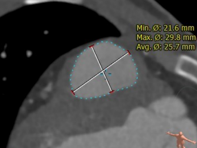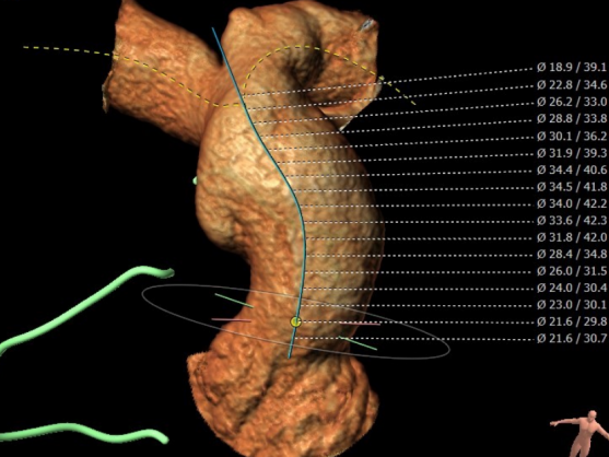 患者男性,19岁,17年前行法洛四联症矫治术,3月前复查心脏超声提示重度肺动脉瓣反流。术前影像学重建提示患者主肺动脉腰部截面呈椭圆,径宽17-21mm,形态测算植入介入瓣后直径20mm。手术经胸入路,在DSA引导下,经右室流出道穿刺植入20号Salus介入肺动脉瓣,术后TEE提示肺动脉介入瓣植入位置理想、固定良好,介入肺动脉瓣无瓣中及瓣周反流。