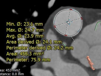 患者女性,21岁,法洛氏四联症矫治术后14年,超声提示肺动脉瓣重度关闭不全伴大量反流,伴三尖瓣轻中度反流。术前行详细影像学重建与评估,主肺动脉腰部截面为类圆形,径宽23-25mm,测算植入介入瓣后直径24mm。术中肺动脉造影测量与术前评估一致。手术经胸入路,在DSA引导下,经右室流出道穿刺植入24号Salus介入肺动脉瓣,术后TEE提示肺动脉介入瓣植入位置理想、固定良好,轻度瓣周漏,无中央反流。