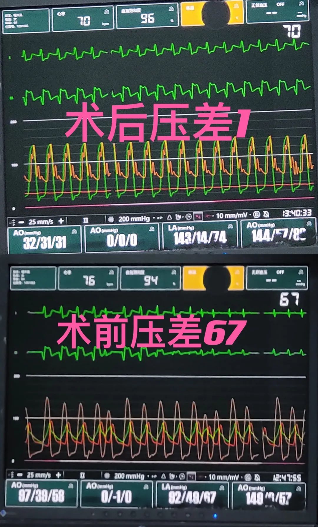 峰值流速:4.3M/s; 最高跨瓣压差:73mmHg; 平均跨瓣压差:43mmHg; 左室射血分数EF值:0.59; 左室舒张末期内径(LVD):5.3 cm。