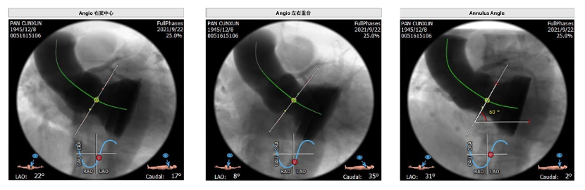 主动脉根部分析:三叶瓣,纯反流无钙化,窦部空间可,冠脉开口高,瓣环水平夹角60度,呈横位心。