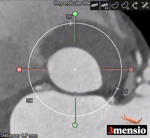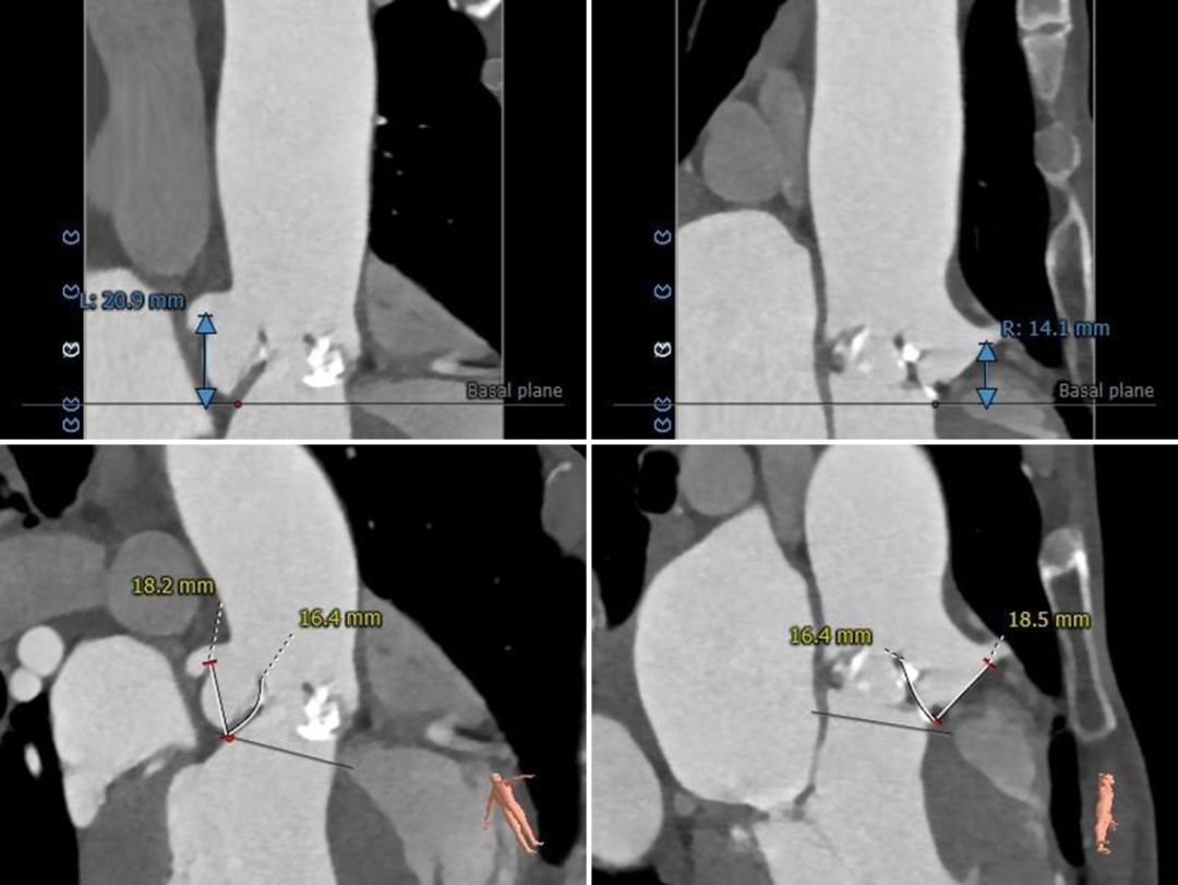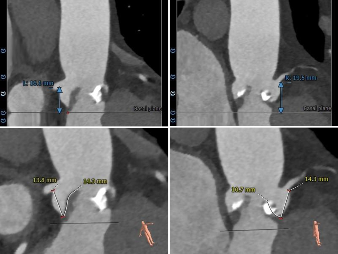 • 双侧冠脉开口高度可,切线位测量左窦瓣叶长度大于左冠开口到瓣叶根部距离;