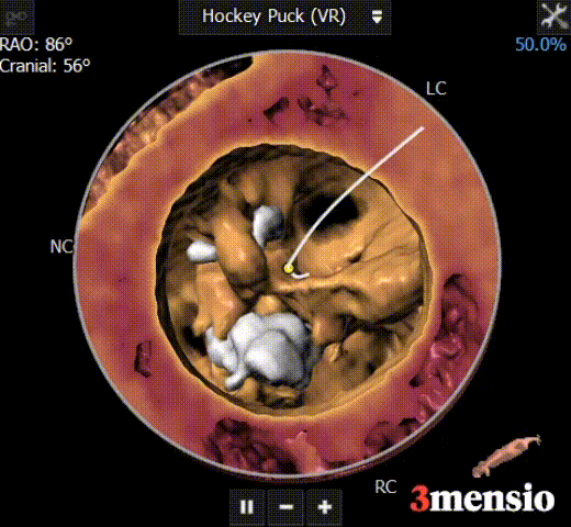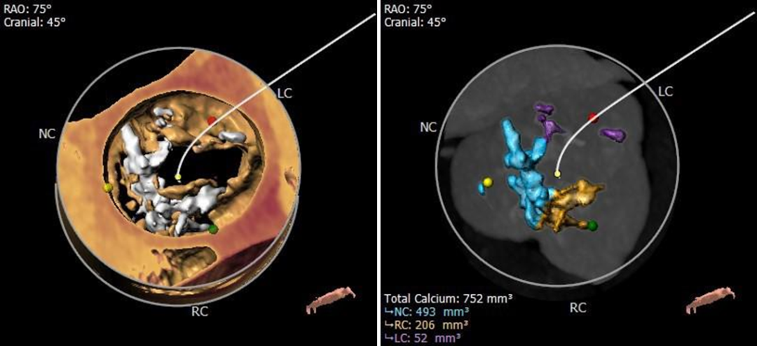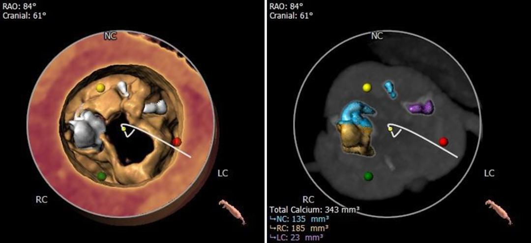 功能性二叶瓣,R-N间团块状钙化融合,CT测量及3D模型体外球扩测试提示左冠阻挡风险高,术中需结合预扩表现可积极采取冠脉保护,必要时采取“烟囱支架”策略。