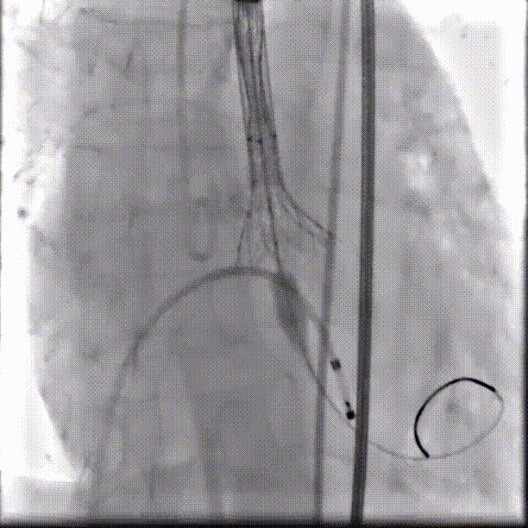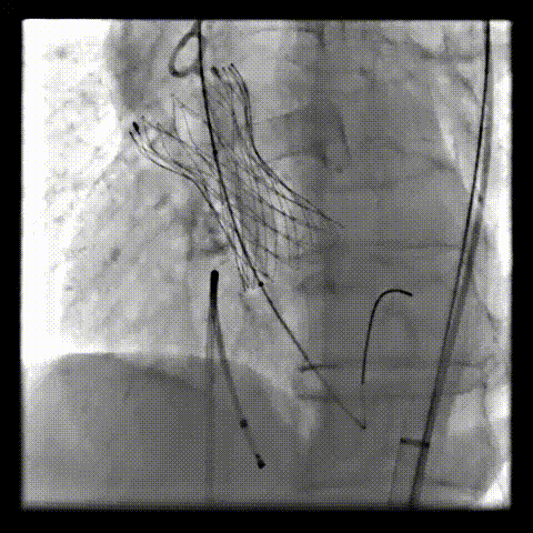 瓣膜(AV23)完全释放后,“烟囱支架”后扩