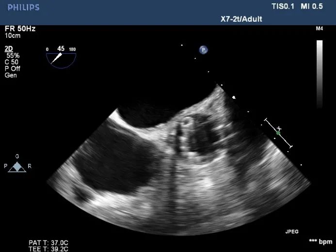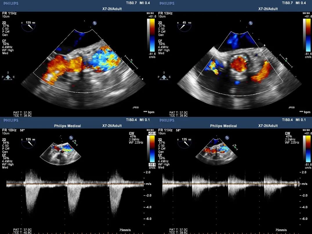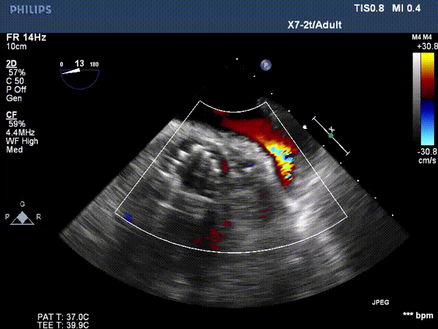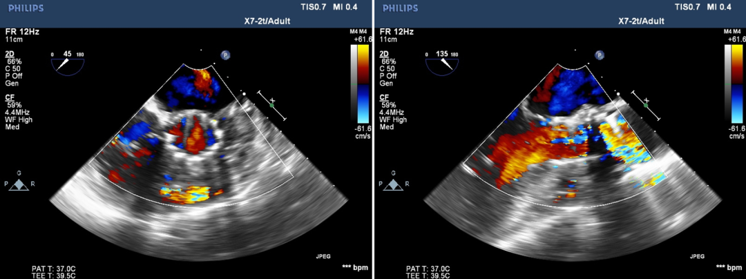 TEE影像,烟囱支架显影清晰,支架内血流通畅