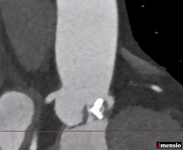 • 功能性二叶瓣,R-N之间团块状钙化融合,瓣叶增厚,团块钙化挤压支架,存在瓣周漏及瓣膜移位风险;