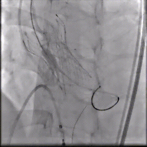 最终造影,“烟囱支架”显影清晰,瓣膜形态及LCA灌注良好