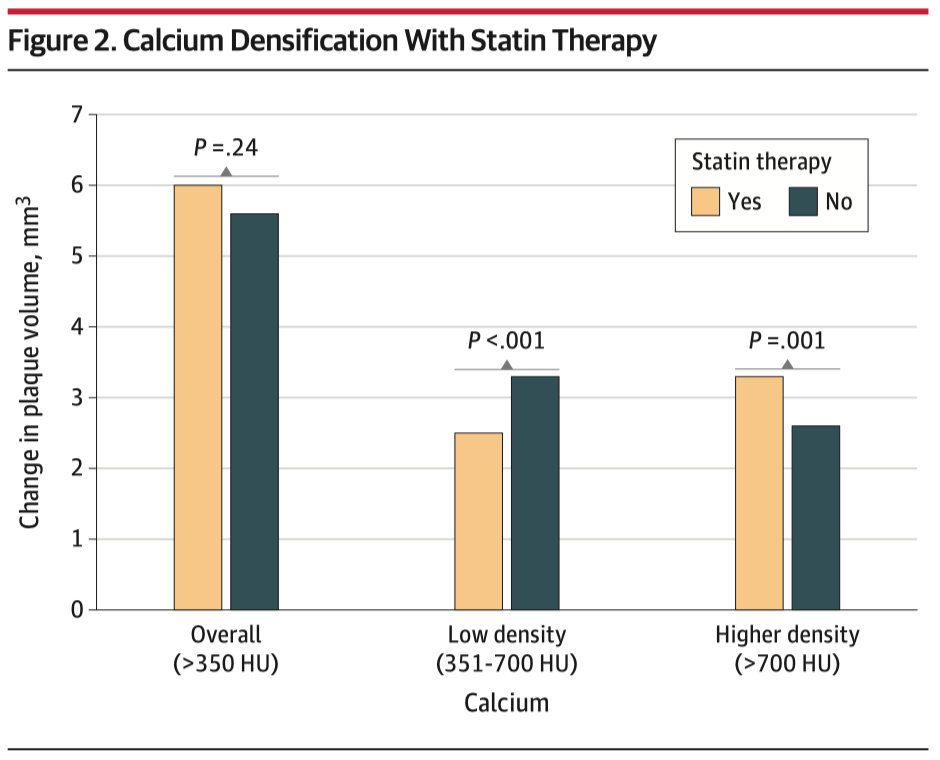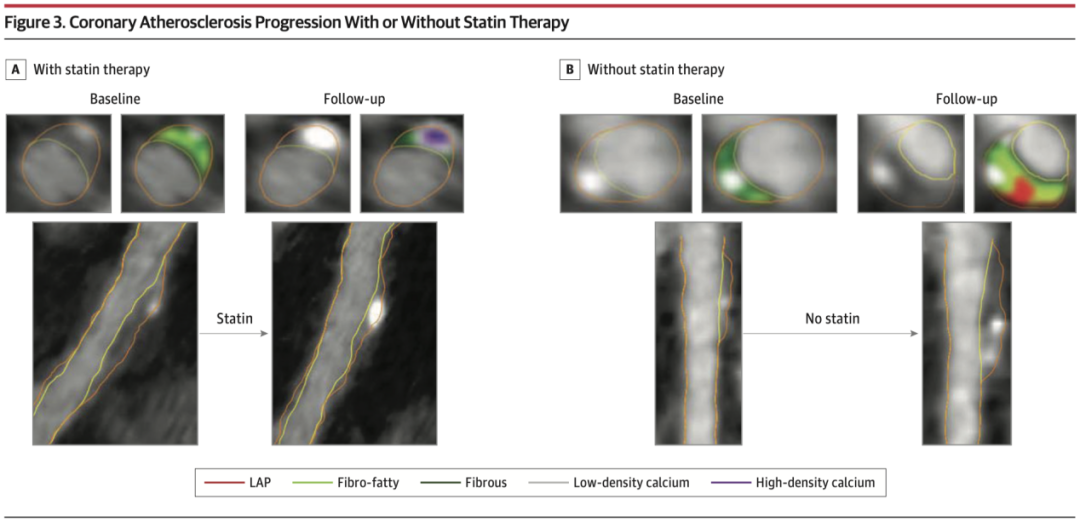 他汀类药物治疗与斑块脂质减少和钙化的增加相关。临床应用他汀类药物稳定冠心病患者动脉粥样硬化斑块以降低心血管事件风险改善患者预后。近期JAMA发表的PARADIGM研究,通过冠脉 CTA 评估动脉粥样硬化斑块密度及钙化程度,随访他汀治疗与动脉粥样硬化斑块进展之间的关系。