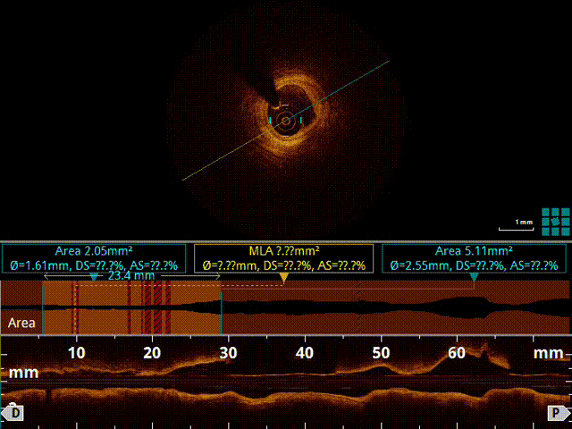 狭窄程度改善后使用OCT及FFR对LAD进行评估,通过OCT可见LAD远端斑块性质为纤维脂质混合斑块,且可见使用预扩球囊扩张造成的斑块破裂影像,MLA:2mm²(图4);压力微导管送至LAD远端测量结果为0.72(图5)。