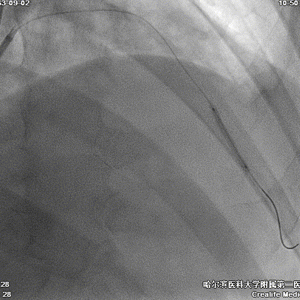 通过FFR与OCT结合检查,专家决定对LAD远端病变使用药物球囊进行介入治疗,使用2.0*15mm预扩球囊再次对病变部位进行预处理(图6),后选择2.0*20mm药物球囊以16ATM持续释放60s(图7)。